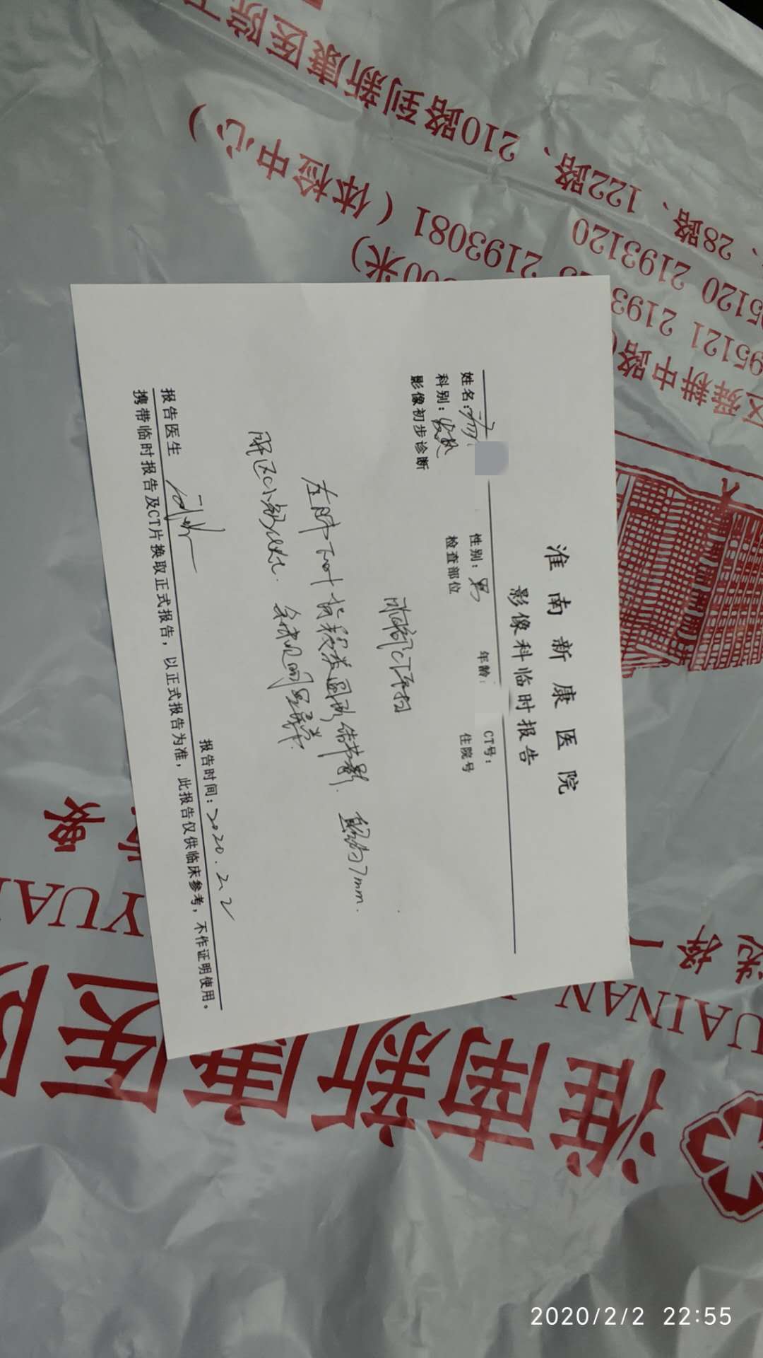 仿佛过了很久,里面屋里突然传来一个护士的声音,问我:“你挂号了吗?”我回答道:“我也不知道在哪挂号啊,一下救护车就被刚才那位医护人员送到这里来了。”经过简单地商量后,她让我加她微信,并先转了一部分医疗费给她,让她帮我办理相关的住院手续。后来我得知她是发热门诊护士长刘利,她对我们社区也非常熟悉,因此在后面几天对我也特别地照顾。又过了一段时间,终于从屋里的另一个门里走出一个包裹严实的护士,开始询问我的病历。与此同时,还让我重新量一下体温,结果还是37.5℃。没过多久,护士又拿来5个采血管进行血常规采样,当时的我还天真地以为采血就是为了进行所谓的核酸检测呢,后来才发现我错了。紧接着,护士又把我带到主楼的放射科,让我再做个胸部CT。由于CT洗片子需要一段时间,放射科医生就让护士先回发热门诊了。刚进入放射室,医生就让我脱掉羽绒服,并平躺在CT机的床位上。在医生的语音引导下,我连续做了几组“吸气”和“呼气”的动作,很快便完成了拍摄。在等片子的过程中,医生又简单地询问了下我的病历,便让我到大厅的座位上等待结果。此时,我的心里是有些紧张的,因为通过之前的新闻报道我早就知道:肺部CT呈“毛玻璃”状是新冠肺炎的典型症状,病情严重的甚至会出现白肺。很快,片子出来了,放射科医生第一时间并没有跟我说结果,而是让我把片子拿回发热门诊,让那边的医生给出最终结果。于是,我拿着袋子便往回走。此时已经快晚上十一点了,我一个人在漆黑的夜色里缓慢地前行着。