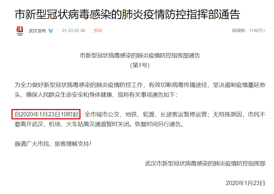 在我回到家的第二天(1月23日),一大早就看到铺天盖地关于“武汉封城”的报道。这可是建国以来第一次啊,由此可见疫情扩散相当迅速。具体公告如下: