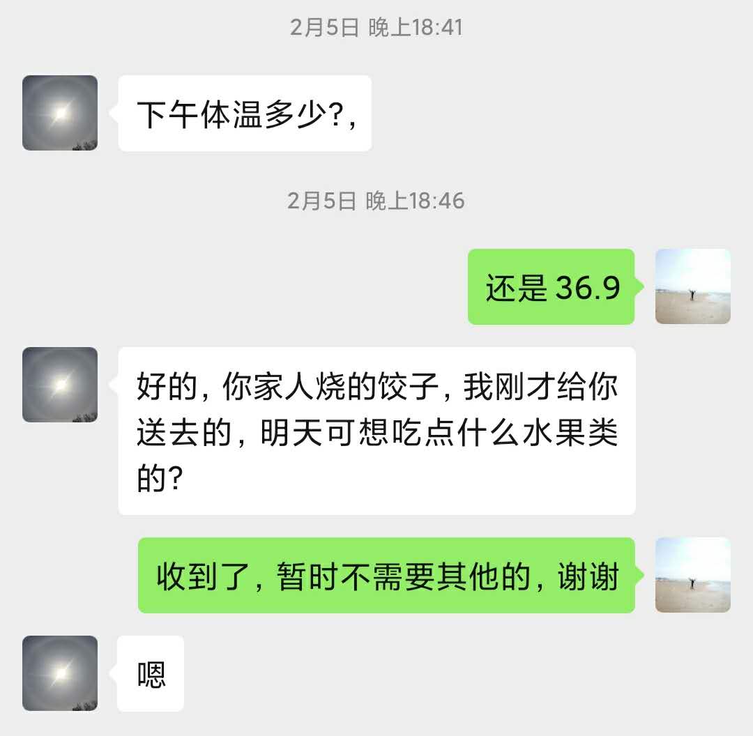 2月5日,天气阴,心情晴。我早上的精神状态也还不错,午饭也基本上吃完了。晚上的时候,居委会给我送来了家里包的饺子,可我没吃几口就实在吃不下了。这便是我这两天的身体状态了。最近几天,我的体温也是一直跟着药在转,早上起床体温一般比较正常,可一到晚上就又逐渐回升到37.3℃左右。这种状态一直持续到2月6号。