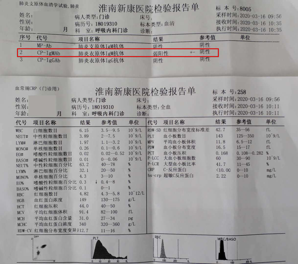 就这样又过了大半个月,随着淮南确诊人数的不断减少,社区也逐步解禁。在此期间,我的身体基本正常,每逢晴天我和家人也经常跑到楼顶晒太阳。但是,我那轻微却极其讨厌的鼻塞和白痰症状还是时不时地出现。为了根治这个毛病,3月16日上午,我毅然决定与母亲一块再到新康医院做一次抽血化验。化验结果为:血常规检测一切正常,只是肺炎衣原体IgM抗体呈弱阳性。医生表示:没有什么大碍,只需要注意饮食和休息,多加锻炼即可。回家后,我吃了两顿新拿的罗红霉素胶囊,鬼症状明显好转。