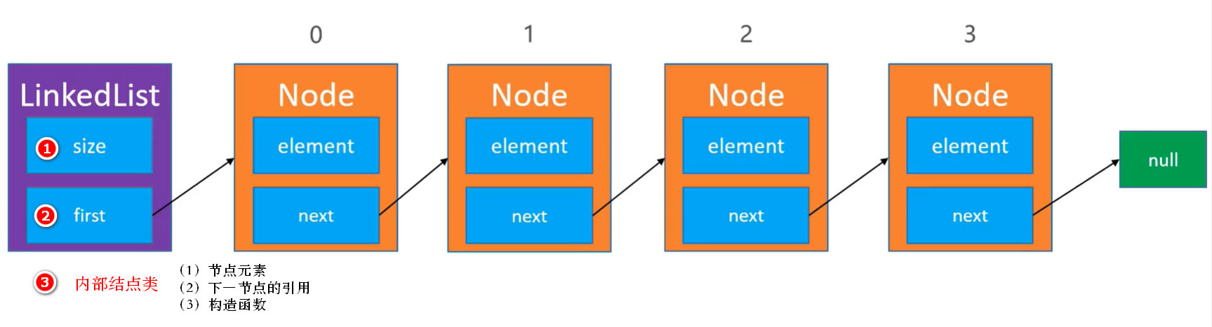 当我们添加一个元素时,首先会创建一个节点(Node)对象,在该节点内部既包含一块用来存放该节点数据的内存空间,又包含一块用来存放下一个节点对象引用(地址)的内存空间。