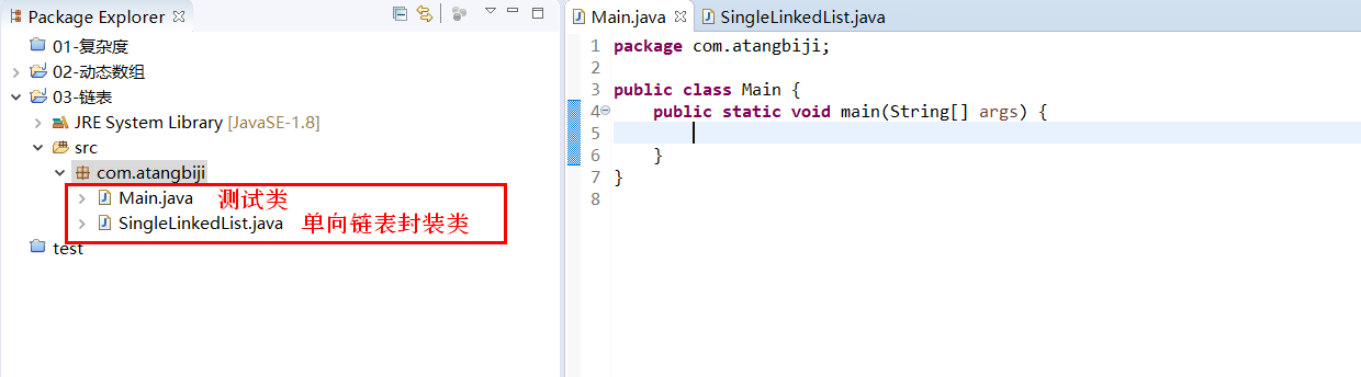 2. 再新建一个名称为Main(包名为:com.atangbiji)的类,用来调用(测试)自己封装的链表。