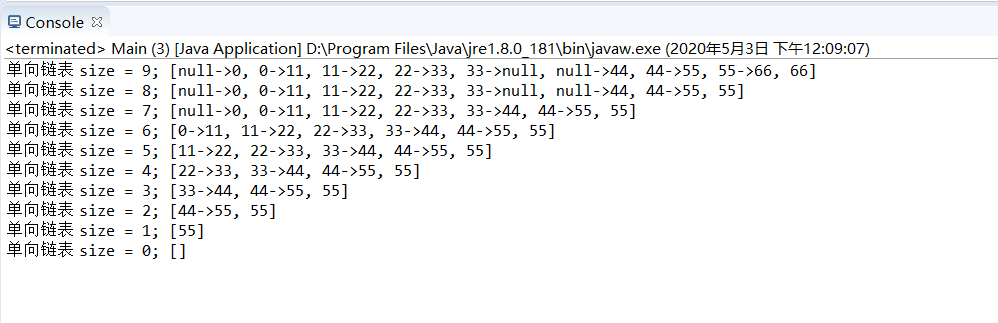 为了更加直观地展现单向链表,我们在输出各节点元素时打印 “该节点元素→下一节点元素”
