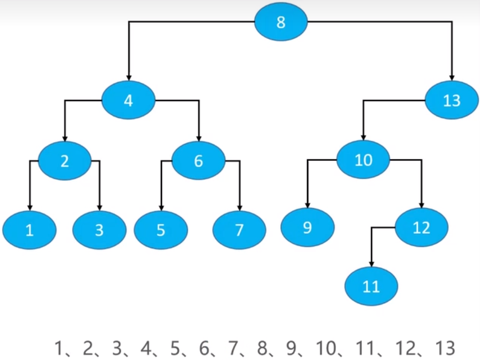 - 任意一个节点的值都小于其右子树所有节点的值。