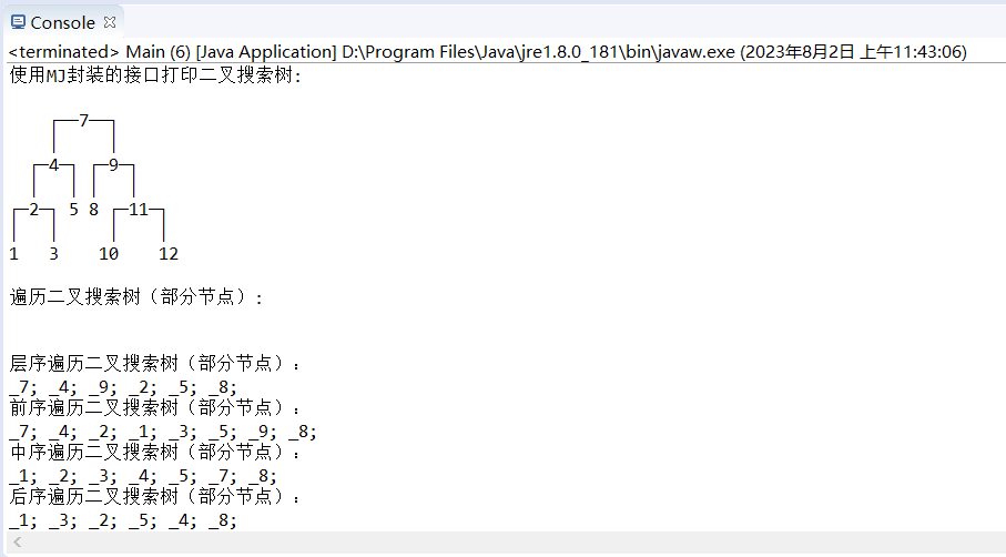 Integer data[] = new Integer[] { 7,4,2,1,3,5,9,8,11,10,12 }; BinarySearchTree<Integer> bst = new BinarySearchTree<>(); for(int i = 0; i < data.length; i++){ bst.add(data[i]); } System.out.println("\n" + "使用MJ封装的接口打印二叉搜索树: \n"); BinaryTrees.println(bst); System.out.println("\n" + "遍历二叉搜索树(部分节点): \n"); System.out.println("\n" + "层序遍历二叉搜索树(部分节点):"); bst.levelOrder(new Visitor<Integer>() { @Override public boolean visit(Integer element) { System.out.print("_" + element + "; "); return element == 8 ? true : false; } }); System.out.println("\n" + "前序遍历二叉搜索树(部分节点):"); bst.preorder(new Visitor<Integer>() {